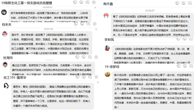 电影结束后,支部党员在线上进行了影片观后感讨论,大家踊跃发言,积极分享自己的观影体会,同时也表达了自己对祖国的深切祝福。