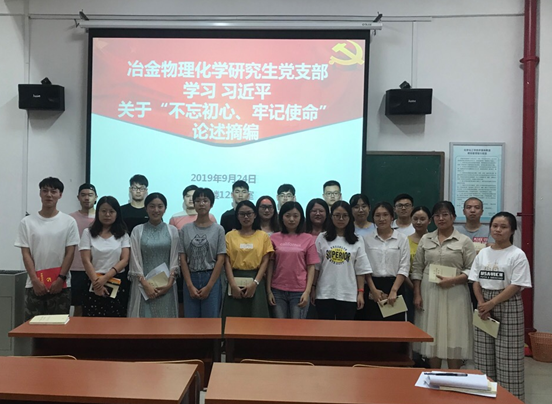 冶金物理化学研究生党支部于2019年9月24日举行了“不忘初心,牢记使命”为主题的研讨会。会议由党支部书记崔鹏同志主持。