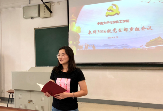 范帆回顾了支部的发展历程,“支部从2018年5月迎来第一批新发展的预备党员,到今天已成功发展了61名学生党员,支部在学院党委的正确领导下,在校党委党校常务副校长赵永正和学院党委组织员李璞联系指导下,不断成长壮大。支部历年来的组织生活开展积极而创新,2017年的主题党日活动‘喜迎十九大诗歌摄影比赛’以及2018年的主题党日活动‘接力书宣言,墨香传化院’都获得了‘中南大学组织生活创新案例’荣誉。在2018年度支部书记‘双述双评’过程中,支部被评为‘优秀’等次。此外,本党支部的党员同志在化学、化工、制药等各大竞赛中崭露头角,均获得了赛事最高奖的佳绩,为学院和学校增添了诸多荣誉。”