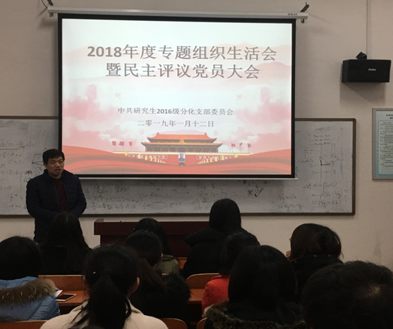 2019年1月12日下午15:00,在新校区化学楼126教室,研究生2016级分化党支部召开2018年度组织生活会暨民主评议党员大会。支部党员同志参加大会,支部联系教职工党员分析科学系党支部书记蒋新宇教授到会指导并作点评。会议由支部副书记赵国庆同志主持。