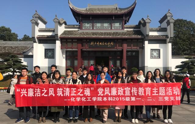 11月29日,在刘少奇主席诞辰120周年之际,化工院本科2015级第一、第二和第三党支部开展以“兴廉洁之风 筑清正之魂”为主题的党风廉政宣传教育主题活动,组织党员同志前往花明楼刘少奇故里学习先辈的光辉事迹和高尚品格。