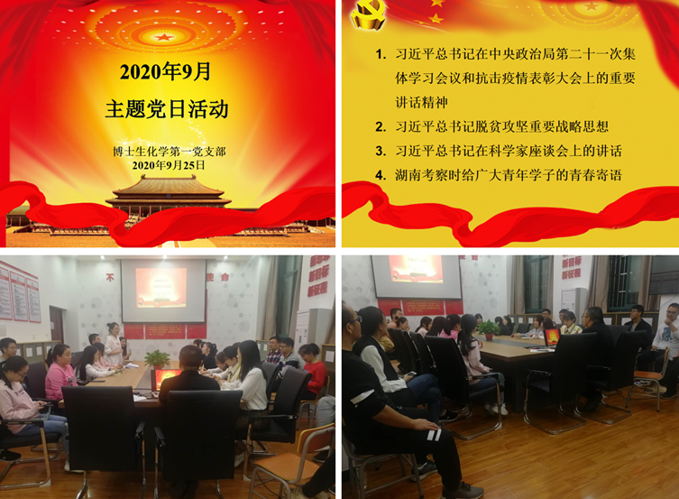 2020年9月25日18:30,博士生化学第一党支部在化工楼132党员活动室召开主题党日活动。支部全体党员参加,支部书记林百宁主持会议。