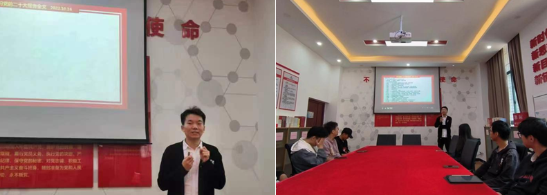 随后,肖茜斤主持开展党的二十大精神专题研讨,耿正雷、韩梓培、霍存帅三位同志分别从坚持党的全面领导、中国特色社会主义现代化、当代青年人目标三个方面进行现场交流发言,肖茜斤分别对三位同学的发言进行评论总结。