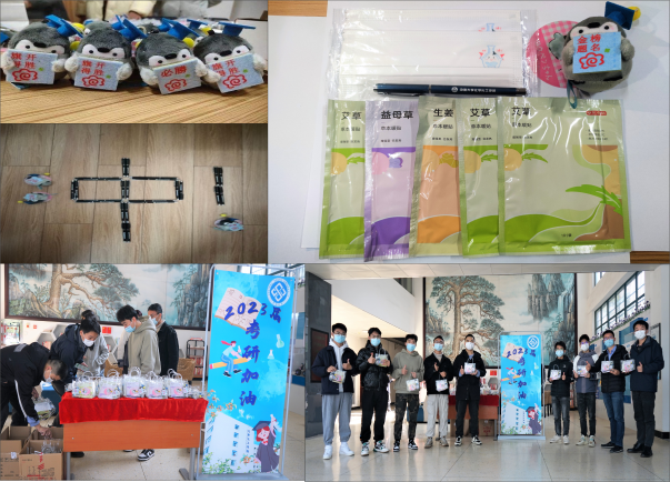 在学院党委刘有才书记、刘又年院长等学院领导老师们的带领下,同学们提前为大四考研学生准备了“考研加油礼包”。礼包中憨态可掬的小企鹅手中拿着“旗开得胜”、“必胜”等字样,预祝同学们考研顺利;定制的轩轩加油口罩贴心地提示着同学们注意防疫安全;而被同学们细心放入礼包的定制笔、保暖贴,更是在这严冬里为考研学子们带来了涓涓暖流。准备考研加油包的同学发挥想象力,用中性笔与小企鹅摆出了一个大大的“冲”字,既代表着奋斗的同学们在这最后的阶段抓紧时间,奋力冲刺;也预示着他们“冲上岸”,博得优异成绩。