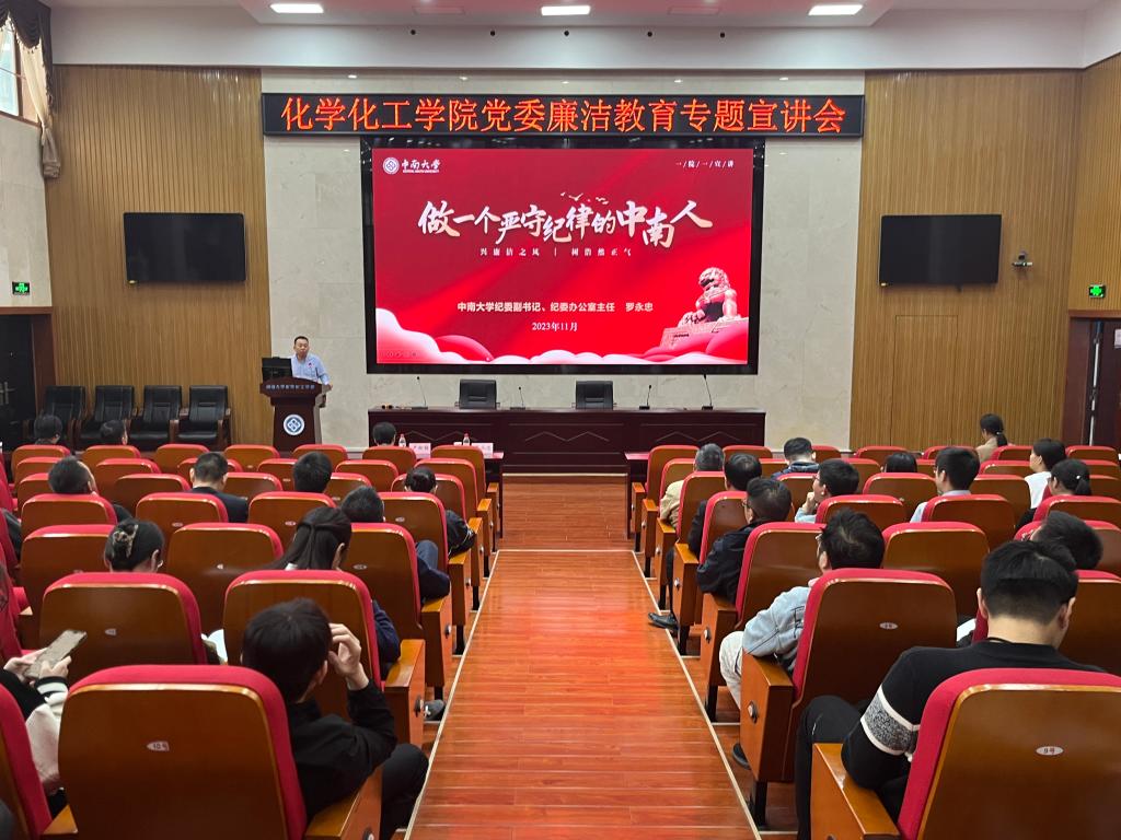 为深入学习贯彻党的二十大精神和二十届中央纪委二次全会精神,持续推进纪律教育、廉洁教育、警示教育走深走实,落实校党委“党风廉政宣传教育月”工作部署和校纪委“六个一”工作举措。11月8日下午,校纪委副书记、纪委办公室主任罗永忠在化学化工学院133报告厅作了题为“做一个严守纪律的中南人”的廉洁教育专题宣讲,学院班子成员、中层干部、办公室行政人员、全体教职工党员和党支部支委参加。会议由学院党委书记刘有才主持。