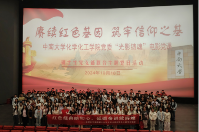 为进一步厚植爱国爱党情怀,加强爱国主义教育,传承和弘扬伟大建党精神,深刻体会一代伟人在革命历程中赓续的精神力量,激励学院党员筑牢信仰之基,10月18日晚18点,中南大学化学化工学院党委组织全体硕士生党支部200余人前往欢乐芒果影城联合开展“赓续红色基因,筑牢信仰之基”10月主题党日活动,集中学习了《光影铸魂·电影党课》,观看了电影《志愿军:存亡之战》。