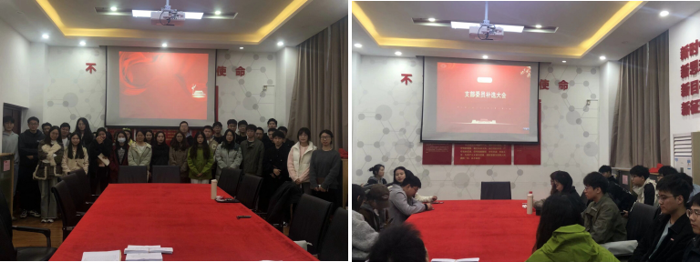 会议第五项,由周晴同志主持支部委员补选大会。周晴同志首先宣读补选选举办法以及差额选举的候选人员名单,候选人依次上台介绍基本情况,最后全体党员经过无记名投票的方式,补选牛传泳、杨爽和罗坚3位同志为支委会委员。随后三位同志表态:以后会认真负责,做好党支部工作,不辜负同志们的信任。