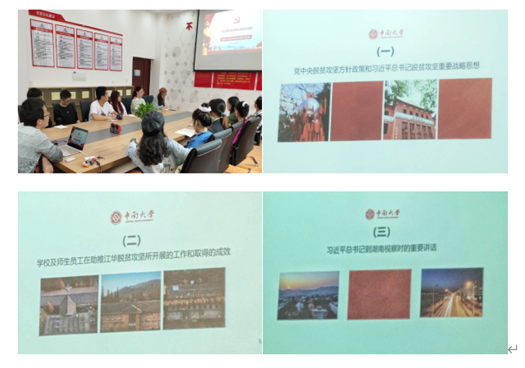会上,支部书记刘世宏同志从《中共中央国务院关于打赢脱贫攻坚战的决定》的八个方面展开,阐释了习近平总书记脱贫攻坚战略思想的主要内涵,交流了对习近平总书记扶贫重要论述的理解,并结合中南大学在扶贫工作的实际做法,使得支部成员对脱贫攻坚政策有了进一步的理解。