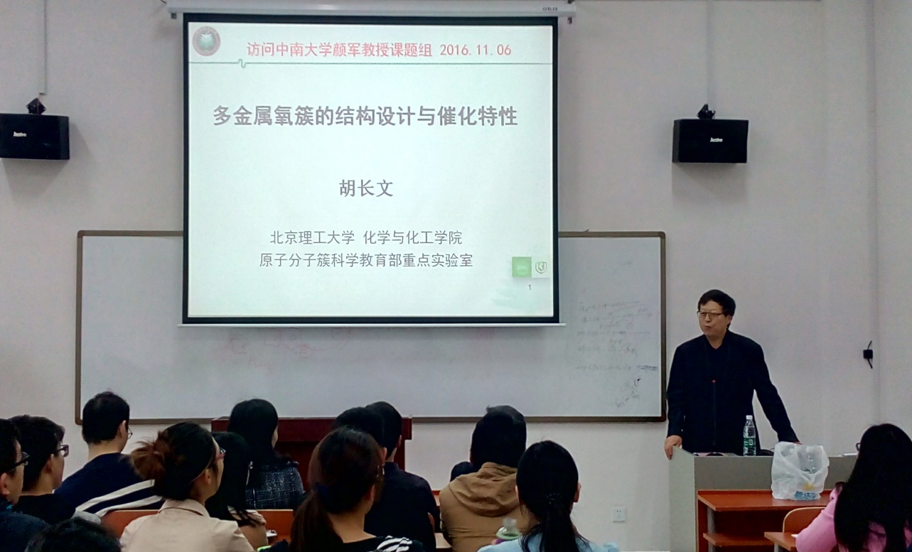 2016年11月06日上午9:30,新校区化学楼125室举办了主题为“多金属氧簇的结构设计与催化特性”的学术讲座,主讲人是北京理工大学化学院院长胡长文教授,本次报告会由中南大学化学化工学院颜军教授主持。