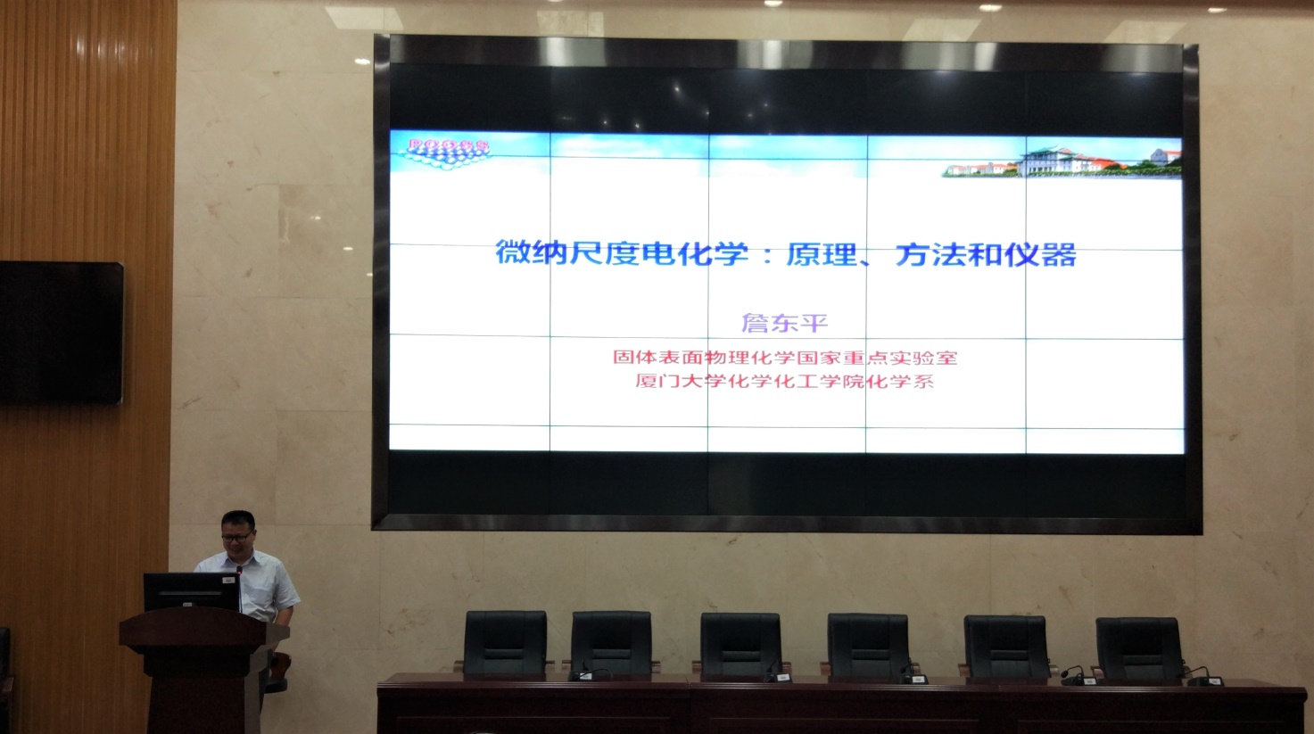 2017年4月22日下午14:30,新校区化学楼133报告厅举办了主题为“微纳尺度电化学:原理、方法和仪器”的学术讲座,主讲人是厦门大学詹东平教授,本次报告会由中南大学化学化工学院向娟教授主持。