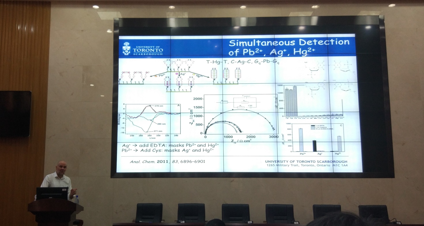 此次报告会,Bernie Kraatz教授主要介绍了生物分析物或生化过程的电化学方法的检测需要在许多情况下,作为检测系统的一部分的氧化还原活性探针的存在。重点是使用的电化学方法来探测核酸,而不需要标记DNA靶。其研究小组已经开发出一种基于阻抗的检测方法,可以检测单核苷酸错配。这种方法不需要任何标记的目标链,依靠监测变化在外部阴离子的氧化还原探针电荷转移电阻作为一个碱基错配的功能。这种效应是由于氧化还原探针扩散到DNA膜的能力所引起的。此外,扫描电化学显微镜(SECM)使用的碱基错配的研究讨论会。它是理想的研究由于电流是有限的氧化还原介质重新生成在修饰电极表面。在这里,已经可以明确地识别单核苷酸碱基错配以铁氰化钾为氧化还原介质溶液的存在基础。其研究结果表明,金属离子的存在,提高了检测的SECM显著。