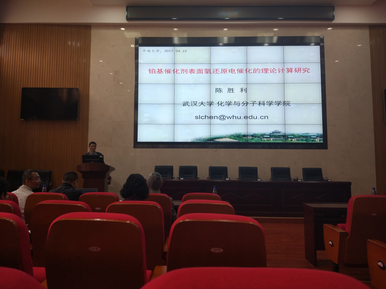 2017年4月22日上午10:30,新校区化学楼133报告厅举办了主题为“铂基催化剂表面氧还原电催化的理论计算研究”的学术讲座,主讲人是武汉大学珞珈学者特聘教授陈胜利,本次报告会由中南大学化学化工学院向娟教授主持。