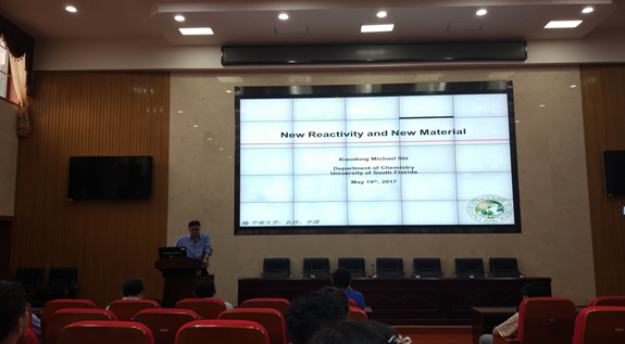 2017年5月19日下午15:00,新校区化学楼报告厅133室先后举办了主题为“Triazole-Au(I) complexes in promoting homogeneous gold catalysis: From stability to selectivity”、“Rational Design, Synthesis, and Chemical Biology Studies of Selective Inhibitors for Protein–Protein Interactions”、“Function Self-Assembly of Giant Supramolecules withIncreasing Complexity”以及“AApeptides: From Structure to Function”的四场学术讲座,主讲人是南佛罗里达大学的四位教授,他们分别是史晓东教授、季海涛教授、李霄鹏教授以及蔡健峰教授,本次报告会由中南大学化学化工学院纪效波教授以及王平山教授主持。