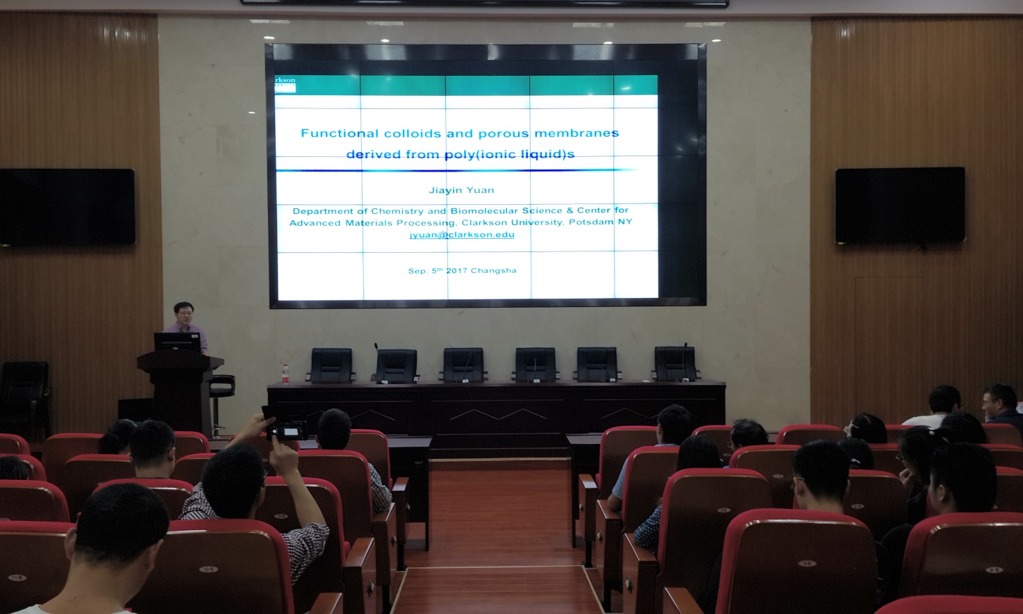2017年9月5日上午9:00,新校区化学楼报告厅133室举办了主题为“Poly(ionic liquid)s and porous membranes derived from Poly(ionic liquid)s”的学术讲座,主讲人是美国Clarkson University/德国Max Planck Institute of Colloids and Interfaces袁家寅副教授,本次报告会由中南大学化学化工学院纪效波教授主持。