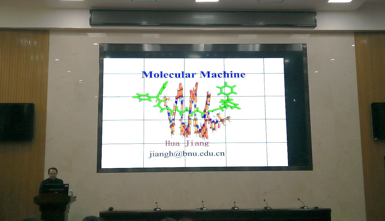 报告会上,江教授从北师大校训校徽讲起,告诉我们“天下之无道也久矣,天将以夫子为木铎”,激励我们要潜心科研,坚持到底。在报告中,江华教授首先提到了分子化学的三位代表性人物:Jean-Pierre Savuage、Sir J. Faresar Stoddart和Bernard L. Feringa。江教授强调分子机器一直是化学家研究的热点,2016年诺贝尔化学奖花落于分子机器研究领域,并把分子机器的研究进一步推向高潮。接着,江华教授简要地介绍了分子机器研究的重要进展,重点介绍他们课题组在分子机器方面所取得的一些研究结果。江华教授课题组基于现实生活中的具体实例,通过核磁分析、晶体解析等手段以三唑类折叠化合物和芳香酰胺折叠体为基体,得到了“分子梭”、“分子转子”、“分子齿轮”、“分子旋转门”等分子机器。江华教授的报告生动有趣,内容精彩,受到热烈欢迎。