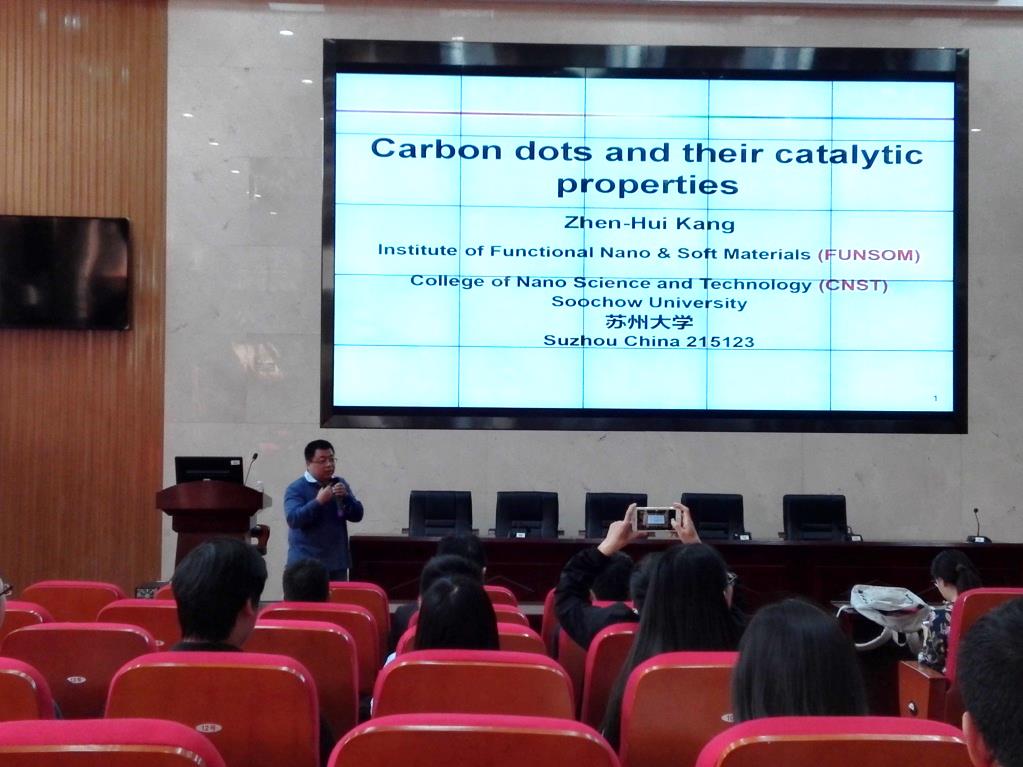 报告会上,康教授汇报了关于碳点用于光电催化剂方面的一些研究进展,包括:(1)碳点的光电化学性质;(2)碳点的光催化应用;(3)碳点的电催化应用。纳米碳点(C-dots),是一类尺寸小于10 nm的新型碳纳米材料。制备碳点的原材料资源丰富且廉价,碳点还具有优异的光化学特性、低毒性、易官能团化等一系列优点。目前碳点已逐渐成为碳纳米材料家族中的重要成员。