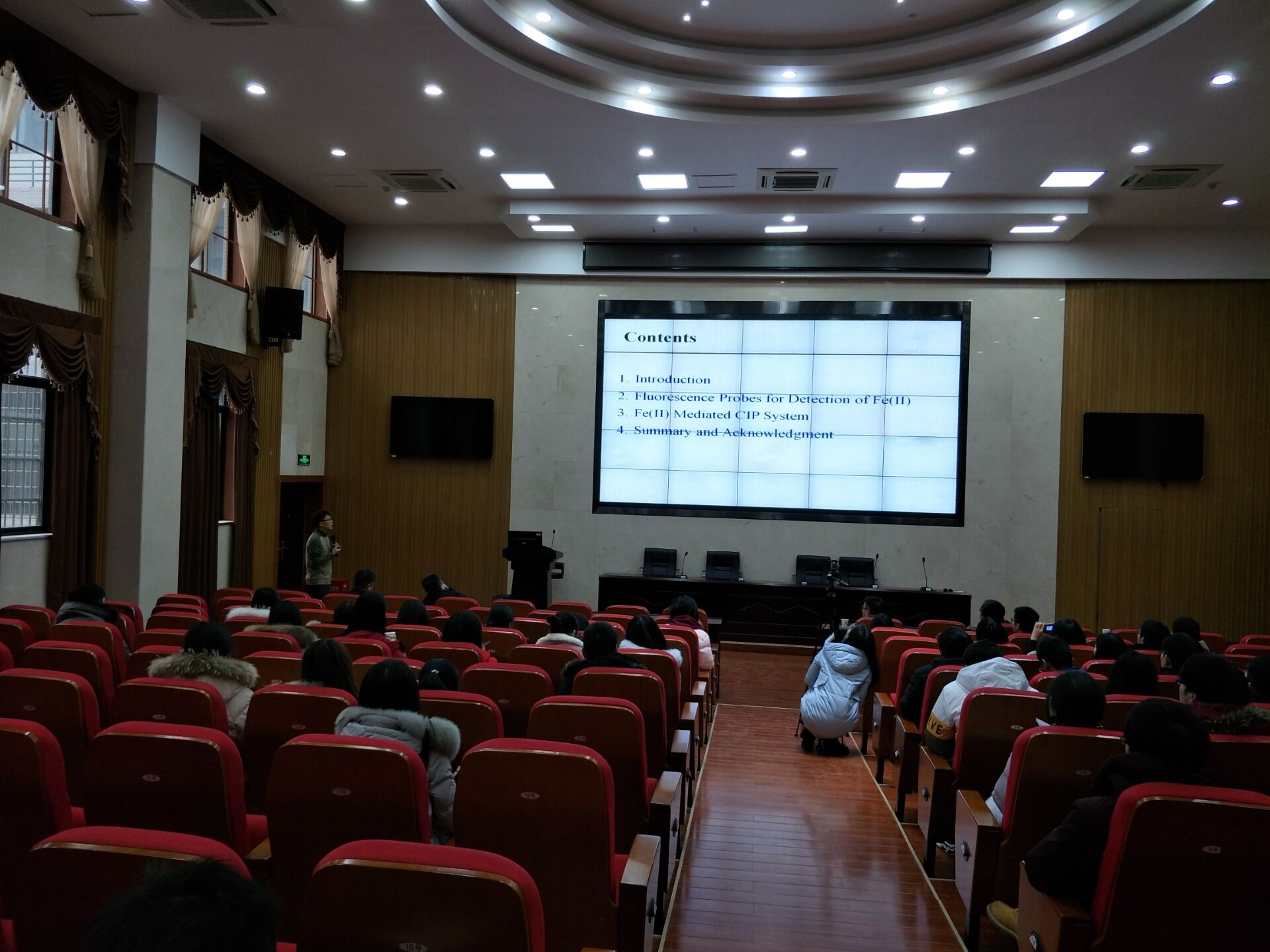 报告会上,王卫教授首先做了自我介绍,介绍其在美国亚利桑那大学担任的重要职务及主要研究方向,且其还是药学院终身教授、博士生导师、药物研发中心主任。王卫教授主要介绍了检测Fe2+的荧光探针,并讲述了在AD(阿兹海默)病人脑中Fe2+浓度高,且Zn2+的存在会促进Fe2+的产生,进而产生ROS(活性氧),最后使细胞死亡,而研究发现,加入DFO会抑制Zn2+的存在,此课题的困难在于实现对Fe2+/Fe3+的灵敏性和特异性。王卫教授也和我们分享了自己的研究历程以及对荧光探针的展望。