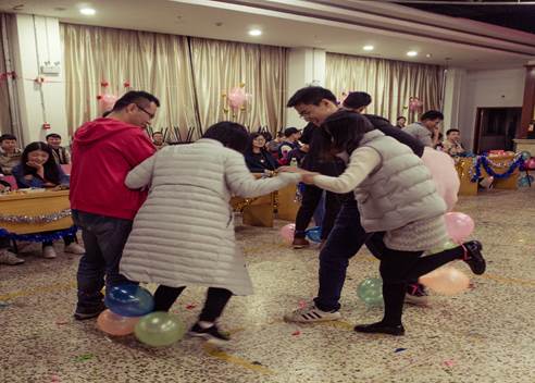 随后,欢快的音乐响起,晚会进入第二个环节,男女同学将双手绑在一起参与踩气球游戏,充分考验了男同学的绅士风度和刚刚认识的两位之间的默契配合程度。游戏过程中,各组同学脸上都洋溢着快乐的笑容。