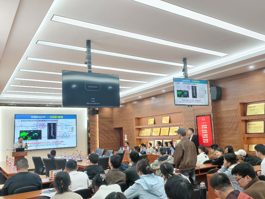 2025年4月12日下午2点,中南大学新校区化学楼129报告厅迎来了第三场聚焦学科交叉前沿的学术报告会。本次会议延续了“精细化工与化学生物交叉研究”的主题,特别邀请到山西大学阴彩霞教授、华东理工大学郭志前教授、四川大学李坤教授担任主讲嘉宾。阴彩霞教授的报告题目为“多细胞系统化学生物学研究”,介绍了多细胞系统中的新兴研究技术及应用。郭志前教授的报告题目为“近红外荧光染料”,围绕近红外染料分子砌块理念设计和产品功能强化展开讲解。李坤教授则以“罗丹明染料的性能调控与应用”为题,分享了荧光染料及应用。报告会由化学化工学院阳华教授主持,来自化学、生物、药学等相关学科的师生代表再次齐聚一堂,共同探讨学科交叉带来的新机遇与挑战。