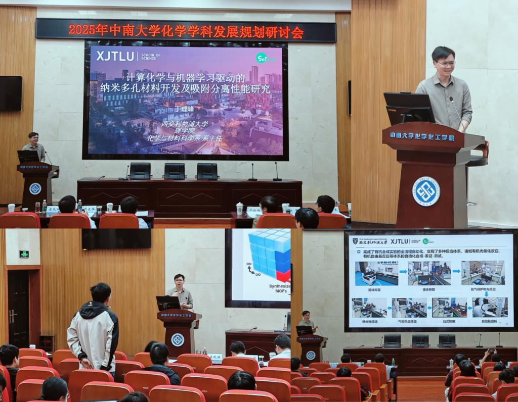 最后,西交利物浦大学理学院化学与材料科学系主任丁理峰副教授带来《计算化学与机器学习驱动的纳米多孔材料开发及吸附分离性能研究》的学术汇报。他指出当前多孔材料数据库(如ARCMOF、QMOF等)积累了海量结构数据,仅靠传统分子模拟手段(DFT、GCMC/MD)已难以覆盖全部材料数据空间。为此,其团队结合深度学习技术,开发智能模型预测材料性能,优化设计流程。在应用层面成果显著:一是通过计算筛选指导共价有机框架气体传感器开发,实现锂离子电池电解液(碳酸乙烯酯)泄漏的早期检测,相关研究发表于《ACS Appl. Mater. Interfaces》《Nature Communication》等顶级期刊;二是推动纳米多孔材料在可控核聚变燃料提纯与分离领域的应用,展现出优异的氢同位素分离性能,研究成果荣登《Science》。丁教授还提出“AI + 机器人化学”的新型材料开发模式,整合人工智能、机器人自动化、高通量分析与综合表征等环节,为材料研发开辟了全新路径。其团队所属的西交利物浦大学理学院,在化学与材料科学、生物科学与生物信息、环境科学三大领域开展前沿研究,科研成果丰硕,且与行业及学术机构建立了广泛且深入的合作,持续推动跨学科创新研究小组的建设与发展。