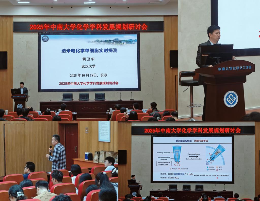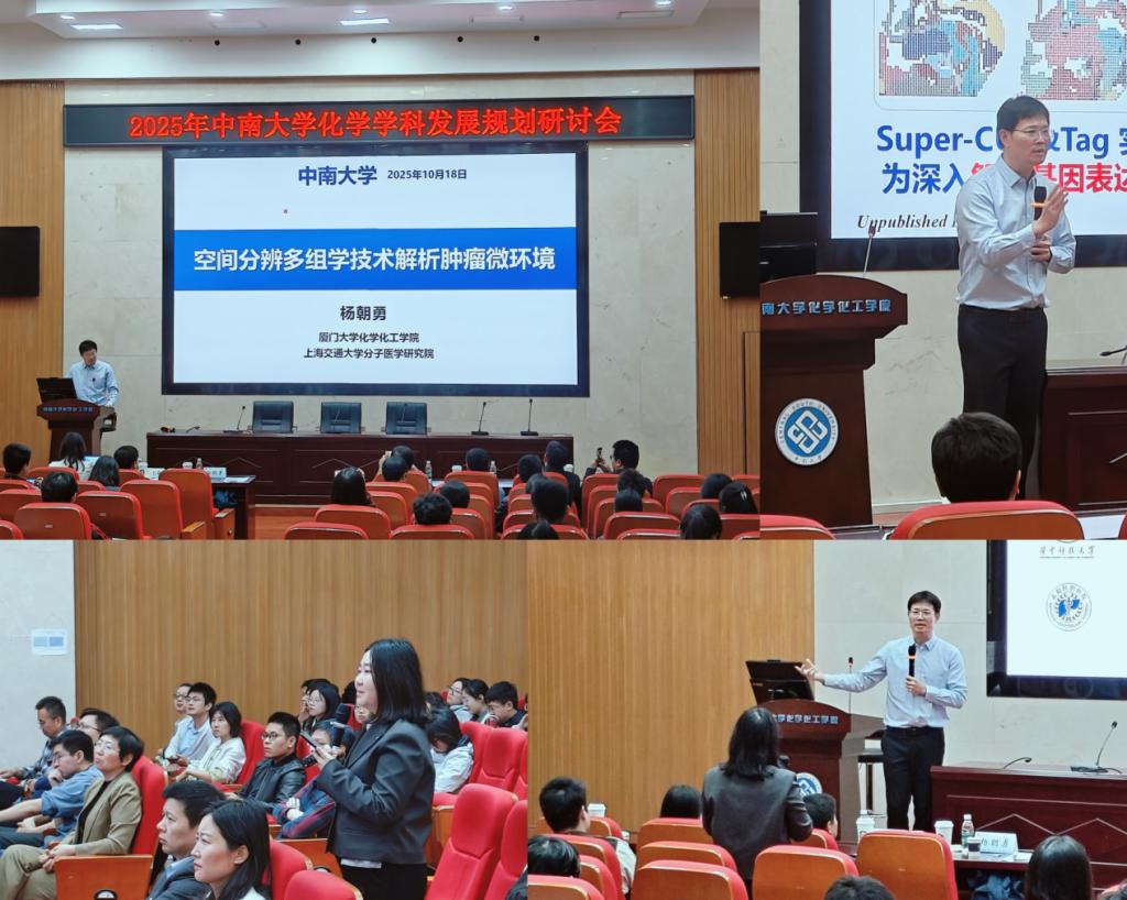 2025年10月18日上午,中南大学名师名家学术论坛在中南大学新校区化学楼133报告厅举行。论坛由中南大学化学化工学院承办,邀请了来自厦门大学的杨朝勇教授、武汉大学的黄卫华教授、中国科学院杭州医学研究所的渠凤丽研究员、中国计量科学研究院的赵洋研究员和西交利物浦大学的丁理峰副教授五位享有盛誉的专家学者,与中南大学化工学科师生共同围绕时空分辨单细胞分析、纳米电化学传感、肿瘤分子诊疗、人工智能驱动蛋白质组学及计算化学赋能纳米材料开发等前沿领域展开深度交流。