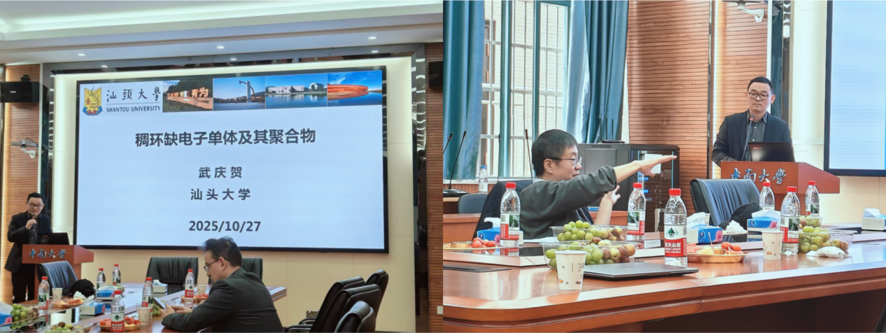 最后,汕头大学武庆贺教授围绕《稠环缺电子单体及其聚合物》主题,重点汇报四方面内容。一是创新稠环单体高效合成法,通过超百种二溴及十余种二硼/锡化合物,创制大量共轭稠环砌块,填补传统方法空白;二是独立合成多种具自主知识产权的稠环缺电子单体与高性能聚合物给体,实现性能和专利双重突破;三是提出多氟化策略,缩短π-π距离、强化分子间作用,使器件光电转换效率超18%且稳定性优异;四是从共轭体系与烷基链比值、薄膜堆积方式、分子结构三方面,解析强吸光聚合物薄膜摩尔吸光系数影响机制,为材料设计奠基。武庆贺教授团队解决了聚合物批次器件重复性、可拉伸性等难题,为该领域研究与应用提供了关键技术支撑。