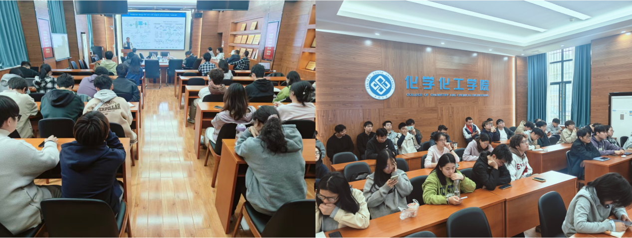 随后,北京师范大学薄志山教授以《有机太阳电池材料与器件的新进展》为题作报告。他从有机太阳能电池的核心原理、发展历程及最新研究进展切入,结合自身研究经验,阐释了有机光伏材料的结构设计、性能优化及实际应用前景,为在场师生带来了兼具理论深度与实践价值的学术分享。薄教授结合课题组近期在有机光伏材料与器件领域研究成果,系统呈现了非稠环受体分子材料与多级次超分子组装技术从设计到应用的完整研究链条。通过对基团改变、偶极分子结构设计策略,提供了新的界面分子设计思路,并成功研发出一系列具备高光电转化效率的光伏材料,为有机太阳能电池的性能突破提供了新的技术路径。