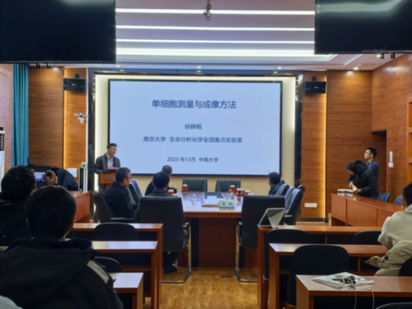 2025 年 12 月 14 日下午,中南大学名师名家学术论坛在中南大学潇湘校区化学楼 129 报告厅举行。此次论坛备受瞩目,南京大学徐静娟教授、南京工业大学戴志晖教授、西南大学卓颖教授、厦门大学朱志教授和中国地质大学夏帆教授五位学界专家相继登场,围绕单细胞测量、脑胶质瘤诊疗、神经小分子检测、微流控生物定向进化和基于固态纳米孔道的分子检测等前沿方向,带来五场聚焦生物传感与分析化学领域的高水平学术报告,吸引了学院师生到场交流。