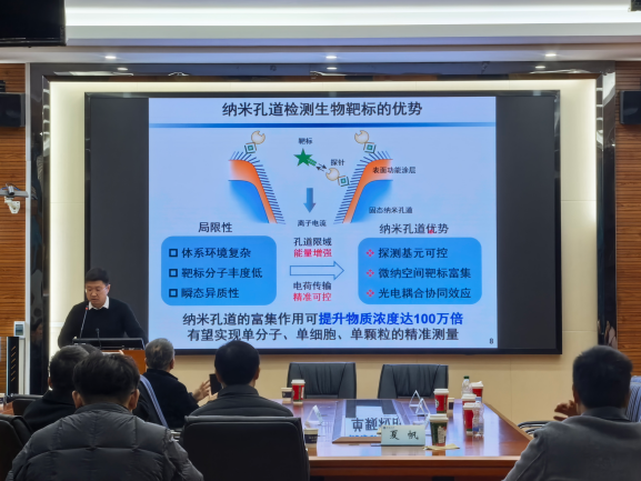 夏帆教授《基于固态纳米孔道的生物分子检测》报告:针对痕量生物分子测量中 “体系杂、丰度低、瞬态异” 的难题,介绍固态纳米孔道技术的优势 —— 通过孔道限域效应富集靶标(可提升浓度百万倍),实现探针可控、光电协同,有望达成单分子级精准检测。