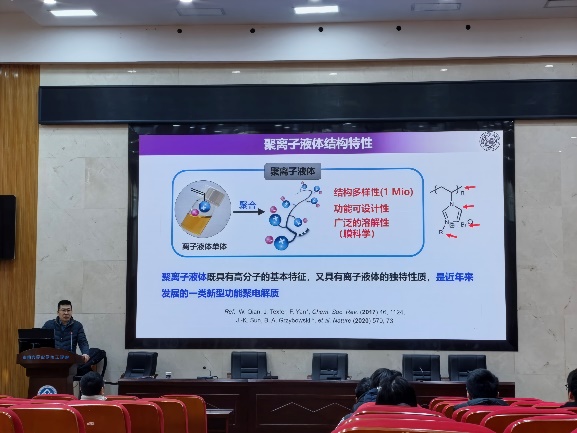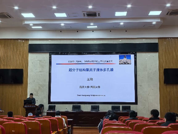 王鸿教授围绕超分子结构聚离子液体多孔膜的设计原理、制备技术及应用场景展开分享。他结合自身在功能聚电解质材料领域的多年研究积累,系统阐述了该类材料在能源存储、分离膜技术等领域的关键突破与产业化潜力。报告中不仅呈现了前沿的学术成果,更通过生动的案例分析,为在场师生揭示了基础研究与产业应用深度融合的路径。