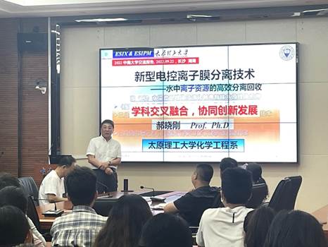 2022年9月22日上午10:00中南大学新校区化学楼129报告厅举办了题为“新型电控离子膜分离技术——水中离子资源的高效分离回收”的学术讲座,报告人是太原理工大学郝晓刚教授。报告会由周涛教授主持,来自全院相关学科的师生们聆听了郝晓刚教授的精彩讲座。