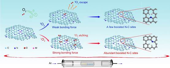 氧还原反应(ORR)动力学速度慢已成为制约金属-空气电池和燃料电池发展的瓶颈。开发低成本、高催化活性、高稳定性的氧还原反应电催化剂是燃料电池研究领域的前沿和热点。在氮掺杂碳材料中,当掺杂氮-碳位点(N-C)与碳本征缺陷相邻时,氮掺杂碳材料能展现出与商业贵金属催化剂相当的催化活性。然而,现有的刻蚀策略所得到的碳缺陷的位置往往是随机的,导致无法有效使碳缺陷与N-C位点形成耦合。因此,设计开发具有普适性、定向性的碳刻蚀策略是构筑高效N-C位点有效的方式,但也极具挑战。