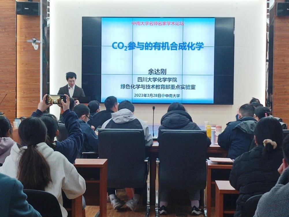 2023年3月28日下午,中南大学化学化工学院在新校区化学楼129报告厅举办了题为“二氧化碳参与的有机合成化学”的学术讲座,报告人是四川大学余达刚教授。报告会由阳华教授主持,来自全院相关学科的师生们聆听了余达刚教授的精彩讲座。