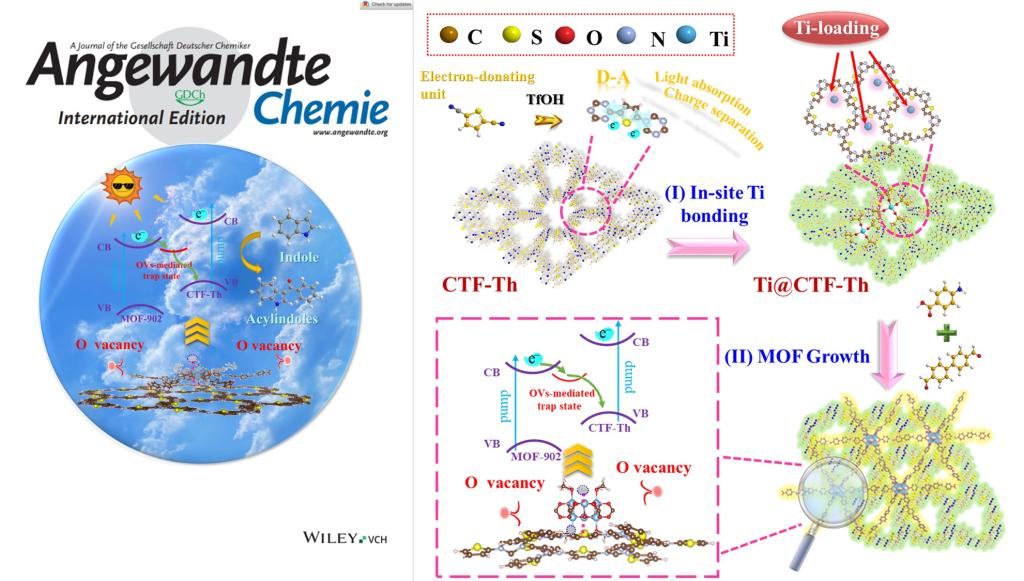 另外一方面,吲哚是染料、农药和药物的重要中间体,其功能化往往需要贵重金属催化剂和苛刻的反应条件(如强氧化剂或高温120度)系列瓶颈问题。因此,开发无金属、可回收、高效的光催化剂体系来实现吲哚功能化,具有重要的学术意义和工业应用价值。鉴于此,本研究设计了一种简单的杂原子诱导组装策略,构建具有可控界面微观结构的S-型异质结纳米片催化剂(MOF-902@CTF-Th1.5)。实验结果表明,Ti原子锚定在CTF-Th纳米片的杂原子S位点上,再通过界面Ti-S键生长MOF-902并产生OVs。调节与杂原子配位的预添加金属原子的数量,能精确调控界面OVs浓度,可增强光生电荷传输,延长载流子寿命,获得更优的光催化剂。同时,MOF-902@CTF-Th1.5的纳米片具有独特的形貌优势,显著促进了电子-空穴对的分离和底物传输,从而实现了吲哚的高效催化酰化。在这些转化反应中,纳米片催化剂相比块状结构更具优势。MOF-902@CTF-Th1.5异质结催化剂综合性能优于大多数报道的光催化剂,在C3-酰基化反应中具有更宽广的底物范围,还展现出优异的循环性能。