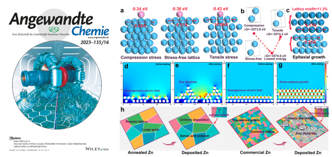 近日,我校化学化工学院唐有根-王海燕教授团队在金属能源界面化学调控的最新研究成果以封面文章发表在化学类国际顶级期刊Angew. Chem. Int. Ed.(2023, DOI:10.1002/anie.202218612),并被选为热点文章,论文题目为“Discovering the Intrinsic Causes of Dendrite Formation in Zinc Metal Anodes: Lattice Defects and Residual Stress”。中南大学为唯一通讯单位,王海燕教授为通讯联系人,2022级博士生谢春霖为第一作者。