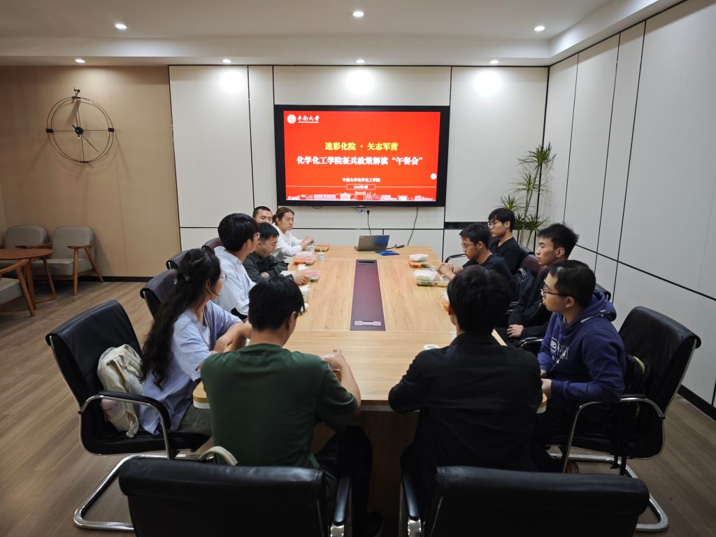 为积极响应国家号召,激发广大学子投身军营、报效祖国的热情,引导学生积极面向国家需求高质量就业,4月23日12时,一场别开生面的征兵政策解读“午餐会”在中南大学化学化工学院举行。