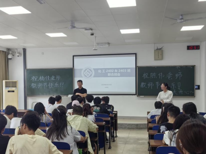 2025年9月10日上午,化工2402班与化工2403班于教学楼A座308联合举办主题班会。本次班会围绕专业认知、职业规划、校园安全及诚信应考四大核心内容,由班导师陈伟、杨佳两位老师主讲,化工2402班与化工2403班全体同学参与。