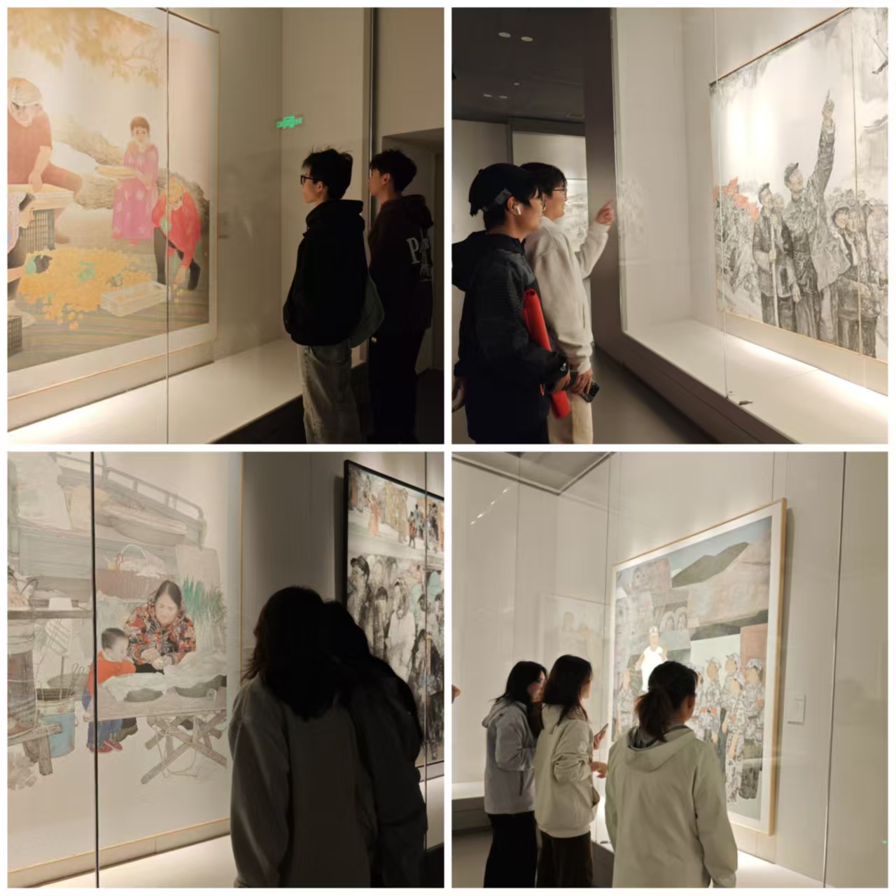 活动当天,同学们统一前往湖南美术馆。途中,团支书周桃竞简要介绍了展览背景:180件作品涵盖中国画、油画等多元形式,由豫湘两省多部门联合主办,是“中原画风”巡展的重要一站。抵达后,在讲解员带领下,大家重点欣赏了《绿城往事》《“杏”福葱岭》《为西山石窟搭建脚手架》等代表作,从市井生活场景到乡村振兴图景,从文化遗产保护到现代精神诠释,作品中“尽精微、致广大”的艺术追求让同学们深受触动,不时驻足交流感悟。