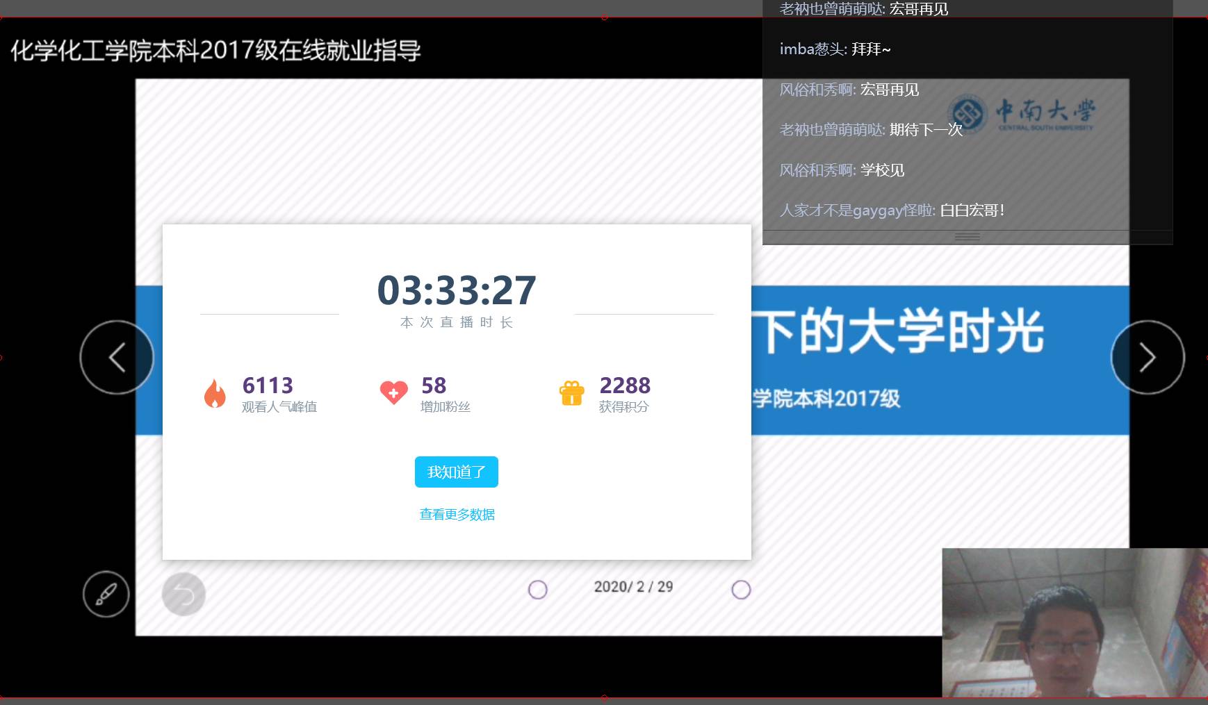 为保证2020年春季学期工作顺利开展,帮助学生顺利过渡到学习状态,做好居家学习生活安排、职业生涯规划以及简历制作等方面内容,2月29日晚,化学化工学院年级大会在bilibili直播间举行,年级大会由辅导员刘世宏主持。会上,294名同学及部分学生家长与支持人一起,就后期学习安排、疫情防控、新学期相关重点工作安排、个人发展规划以及简历制作等等进行了线上交流。