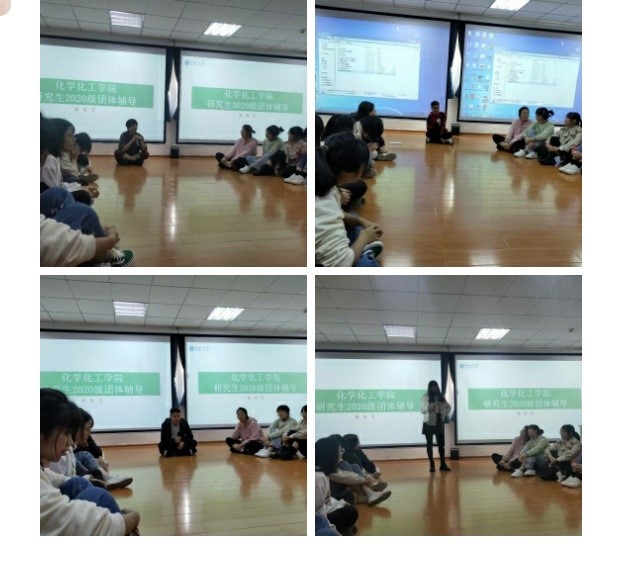 为增强新生在全新环境中对科研、生活、情感、学业以及社交等各方面的适应能力,11月4日早上,化学化工学院“有机高分子班新生适应性团体辅导” 活动在新校区毓秀楼313室进行,本次活动由辅导员滕晓雯老师主持,2020级硕士2班全班同学参加本次活动。