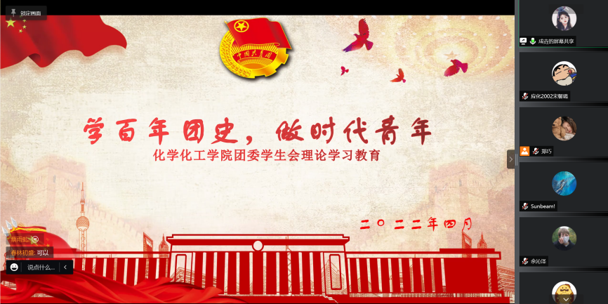为迎接党的二十大胜利召开和庆祝中国共产主义青年团成立一百周年,化学化工学院学生会于4月3日晚召开线上理论学习教育大会。会议由学生会办公室主任郑巧主持,学院团委学生会主席团和部长团全体成员参加。
