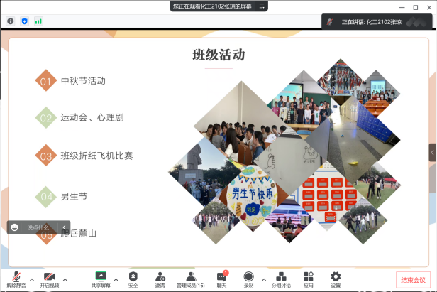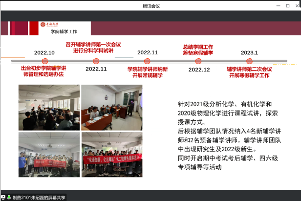 1月12日下午,化学化工院21级学生干部述职会于线上顺利召开,21级辅导员胡雨琪出席本次活动,21级5位年级长、11位班长参加会议对大二上学期的工作进行述职。