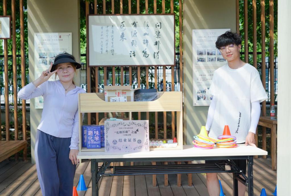 第二站来到“水下蓝缎”“氦人听闻”,同学们在玻璃皿中留下蓝色印记,吸入氦气后秒变小黄人,引得围观同学哈哈大笑,第三站“有求必应屋”,幸运的同学看到了美丽荧光,第四站“掌上火焰”,在实验员的讲解与指导下,同学们学会了火焰咒,在自己手掌中释放出熊熊火焰,来到最后一站,此前收集的印章发挥了作用,同学们既可以换一杯液氮冰激凌解暑,又可以换取套圈机会,赢得自己心仪的奖品。