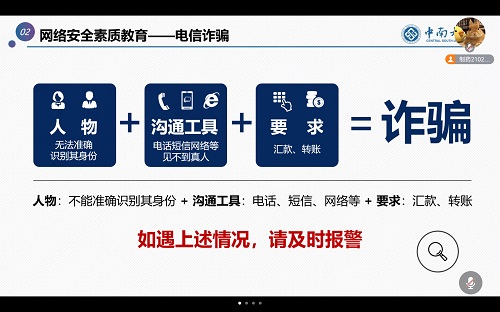 随后进行了大学生网络安全素质教育,电信诈骗不仅会导致损失个人财产,还可能导致身心健康问题,大学生要自觉维护国家网络安全,遇到类似电信诈骗的情况要及时报警。