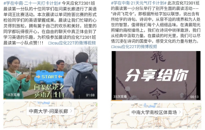 为培养学生持续养成良好的生活作息和学习习惯,推进“学在中南”建设,化学化工学院应化T2301班响应学校号召开展“学在中南·21天晨读元气打卡活动”。在2024年3月25日至4月10日之间,应化T2301班晨读第一小分队开展了丰富多彩的晨读活动,既有趣味比赛让同学们在学习知识的同时获得快乐,又有分享与合作让同学们增进彼此了解。