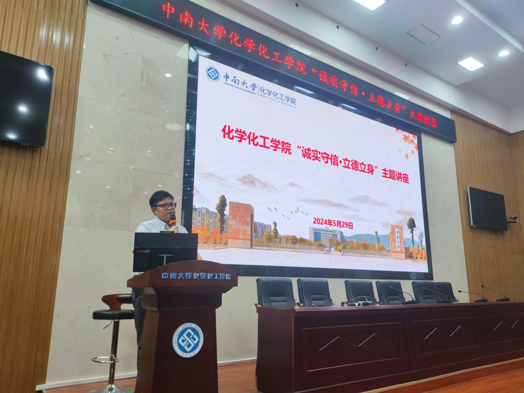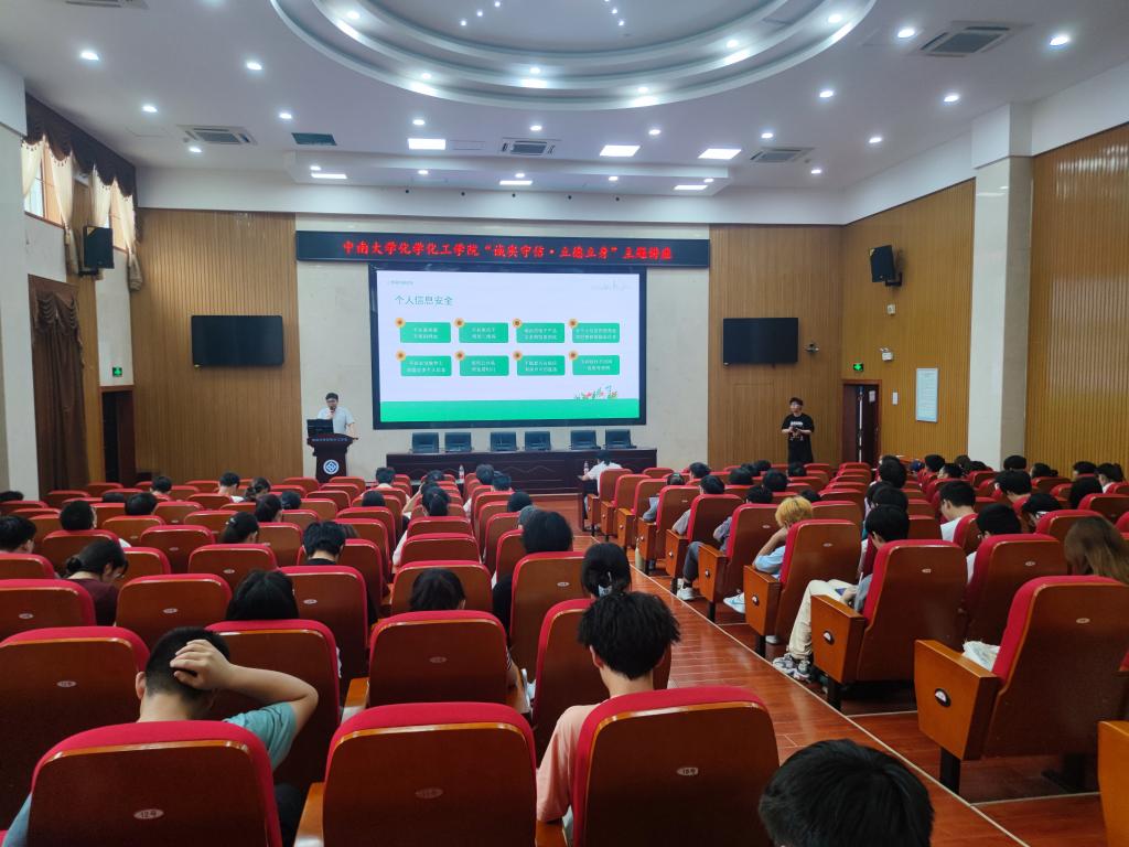 2024年5月29日下午,化学化工学院在化工楼133开展了“诚实守信,立德立身”主题反诈诚信教育讲座,会议由招商银行长沙分行职员祝绘宁主讲,研究生辅导员赵元超、本科生2023级辅导员肖茜斤出席会议,本硕博各年级各班均派出代表参会。本次讲座为2024年度中南大学化学化工学院学生资助诚信教育主题活动,学院邀请金融领域专家,普及防范金融诈骗、电信诈骗和不良校园贷等方面的知识,切实增强大学生的诚信意识和金融安全防范意识。