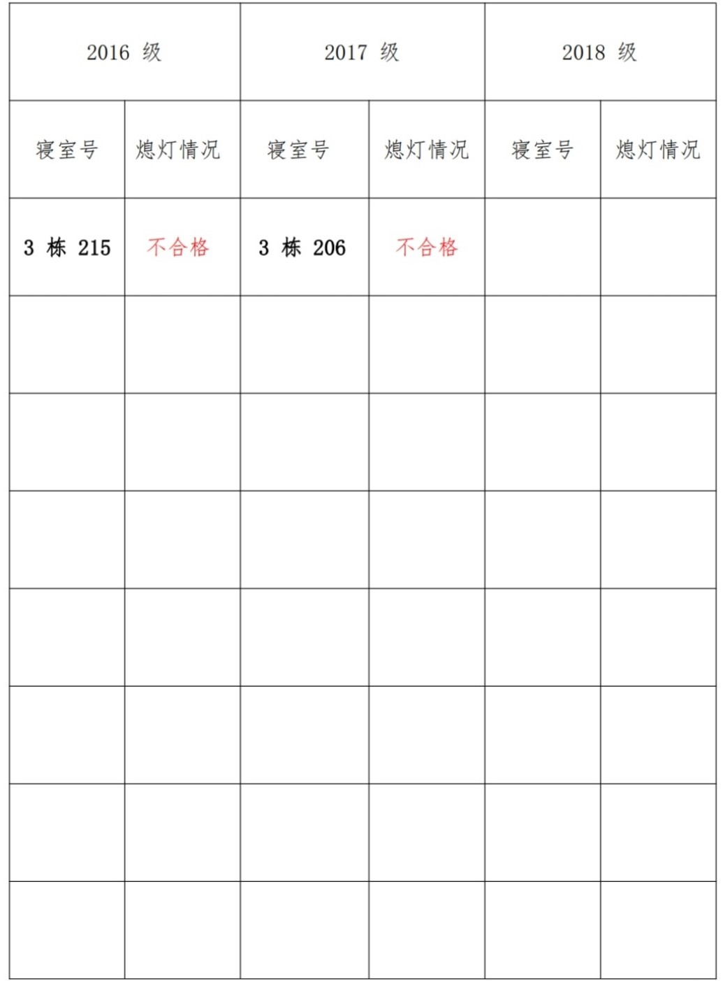 为改正各种不良现象和陋习,增强宿舍学习氛围,营造温馨家园氛围,化学化工学院学生会生活部对三个年级所有寝室进行熄灯检查。本次熄灯情况通 报不合格寝室 2 间,具体情况如下: