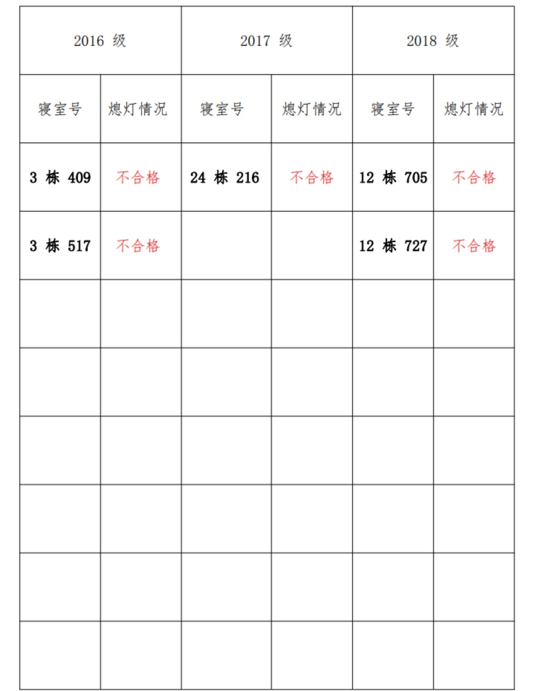为改正各种不良现象和陋习,增强宿舍学习氛围,营造温馨家园氛围,化学化工学院学生会生活部对三个年级所有寝室进行熄灯检查。本次熄灯情况通报不合格寝室 5 间,具体情况如下: