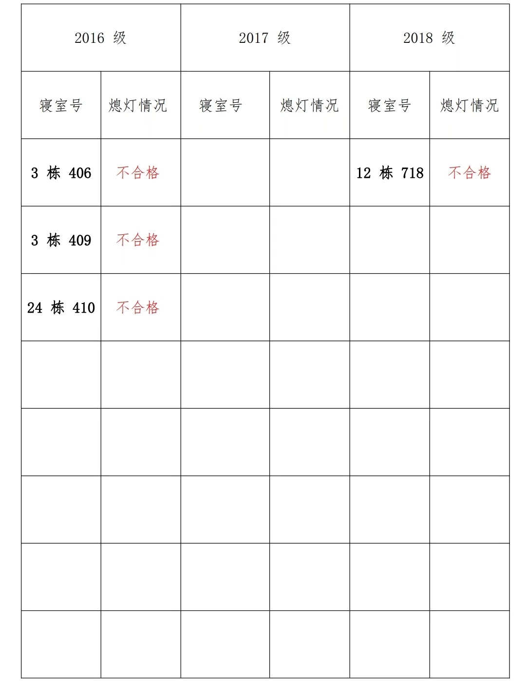 为改正各种不良现象和陋习,增强宿舍学习氛围,营造温馨家园氛围,化学化工学院学生会生活部对三个年级所有寝室进行熄灯检查。本次熄灯情况通报不合格寝室 4 间,具体情况如下:
