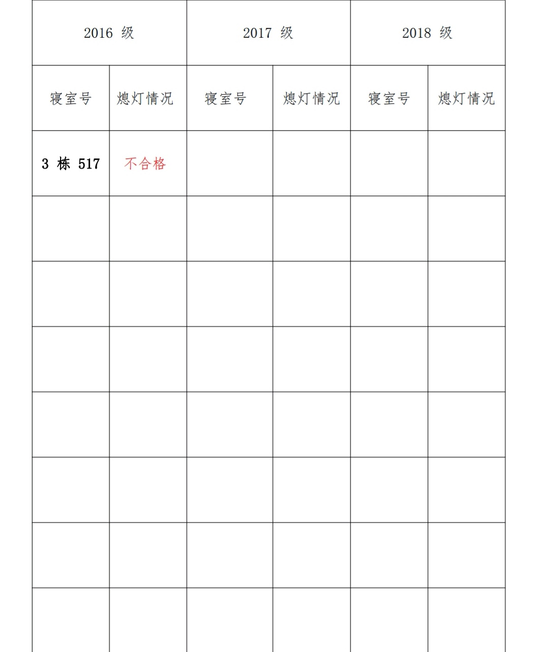 为改正各种不良现象和陋习,增强宿舍学习氛围,营造温馨家园氛围,化 学化工学院学生会生活部对三个年级所有寝室进行熄灯检查。本次熄灯情况通报不合格寝室 1 间,具体情况如下: